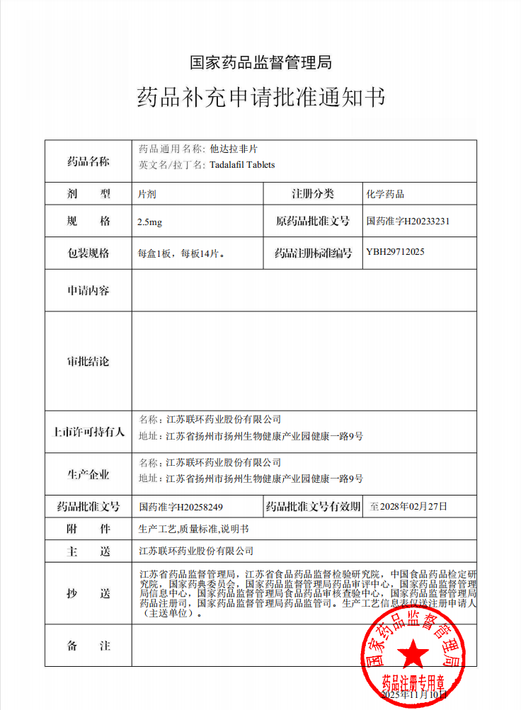 喜讯!九州酷游(ku游)他达拉非片取得药品补充申请批件